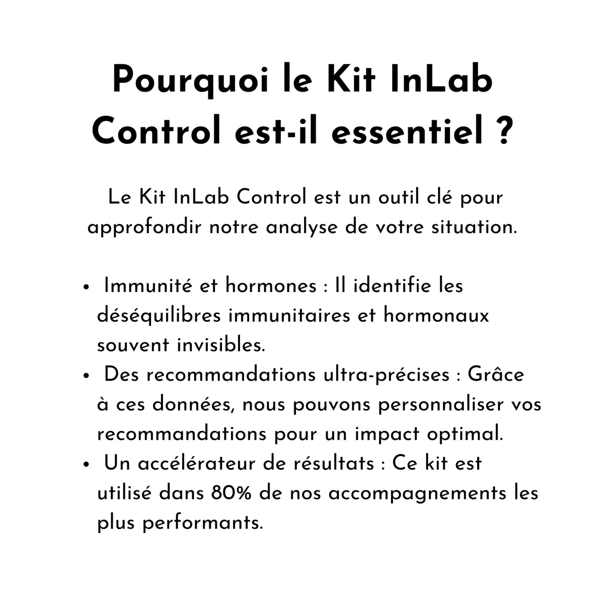 Analyse approfondie : Le Kit InLab Control vous offre une compréhension précise de votre immunité et de vos hormones pour des recommandations ultra-ciblées.